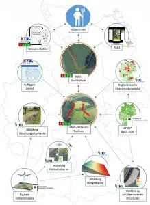 - In PAM3D (2017-2021) wurden Dienste zur Verarbeitung von Höhendaten aus Satelliten-, Laserscan-, Traktor- und Drohnendaten sowie zur teilflächenspezifischen Berechnung der Hangneigung entwickelt, wodurch nun auch die Einhaltung von Hangneigungsauflagen möglich wird