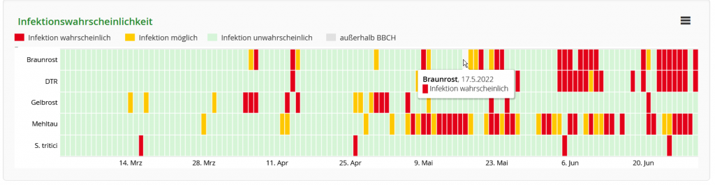 Die Infektionswahrscheinlichkeit ist als Interpretation der Witterungsbedingungen (Temperatur und Blattnässedauer) und deren Einfluss auf die Entwicklung einer Infektion zu verstehen. SIG unterstützt den Anwender bei der Einschätzung des Infektionsdrucks und verfolgt das Ziel den zeitlichen Aufwand für die Bestandeskontrollen so weit wie möglich zu minimieren.