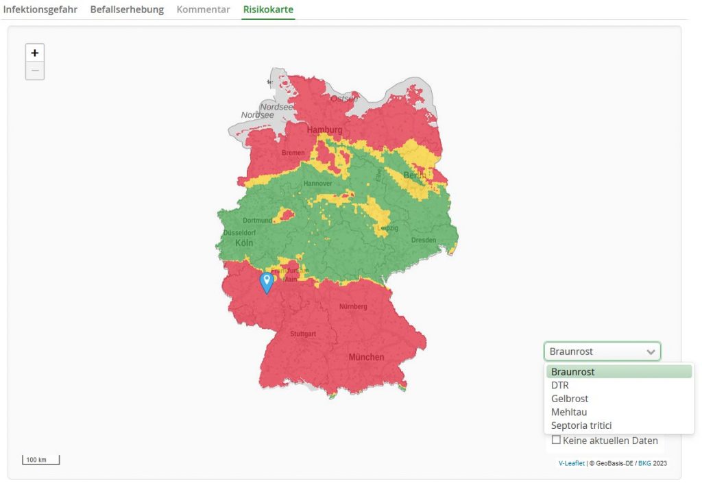 Abb. 2: Deutschlandweite Risikokarte am Beispiel Braunrost in der Kultur Wintergetreide.