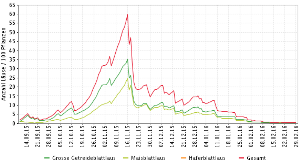 Das Modell wurde im Rahmen des Projektes „Migration und frühe Populationsentwicklung von Blattläusen in Wintergetreide“ entwickelt und steht der Beratung online unter www.isip.de zur Verfügung. Der aktuelle Gefährdungsstatus wird zunächst in einer Regionalübersicht dargestellt. Für vier Aussaattermindekaden wird angezeigt, im Bereich welcher Wetterstationen eine Feldkontrolle zum Blattlausbefall erforderlich ist. Damit kann dann abgeschätzt werden, ob eine Insektizidbehandlung zur Vektorenbekämpfung notwendig ist. Daneben kann der Individualbefall eingegeben werden, um den populationsdynamischen Verlauf im Bereich ausgewählter Wetterstationen zu simulieren.